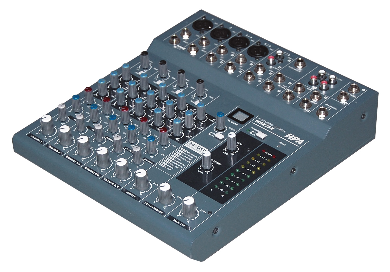- Trim with Peak LED, HPF (CH3-CH6), 3-band EQ. 1 AUX, 1EFX & balance for stereo input